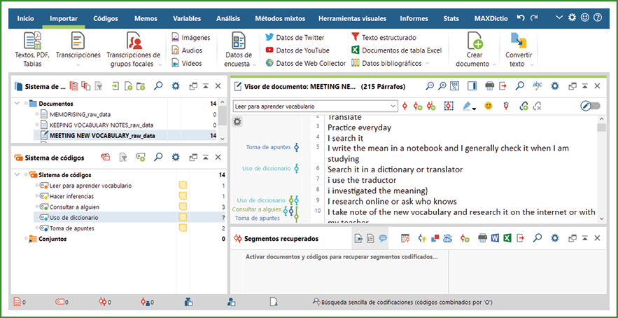 Posteriormente, cada una de las cuatro columnas fue copiada en un documento de Microsoft Word para tener archivos separados, los cuales fueron exportados al software de análisis cualitativo MAXQDA 2020. En una primera etapa, las respuestas de los 215 estudiantes fueron revisadas para que el investigador se familiarizara con ellas y tomara nota de los primeros patrones. Como segunda etapa, se llevó a cabo la generación de códigos motivada por los datos, para cada una de las cuatro preguntas de la encuesta, bajo un enfoque de codificación abierta. La actividad consistió en seccionar los textos y asignarles un código representativo de todos los segmentos en común, como se puede observar en la Figura 3.