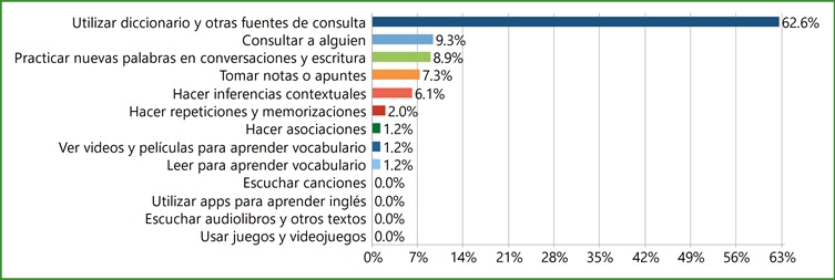 En segundo lugar, con 8.9%, emergieron las acciones relacionadas con la práctica de las palabras nuevas, una vez encontradas por primera vez en textos escritos u orales. Con una frecuencia similar, se encontró que los estudiantes también toman nota o apuntes de estas palabras nuevas (7.3%) y hacen inferencias contextuales para aproximarse al significado de las mismas (6.1%). Los estudiantes reportaron que consultan a profesores, compañeros de clase, amigos y familiares para aclarar dudas de vocabulario (9.3%). Otras acciones estratégicas, con frecuencias menores, fueron hacer repeticiones (2%), ver películas y videos para encontrar palabras nuevas (1.2%), leer más para hallar palabras nuevas (1.2%) y hacer asociaciones con las palabras nuevas (1.2%).