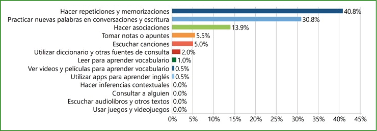 La toma de notas o apuntes emergió como la categoría más mencionada por la muestra, seguida muy de cerca por el uso de diccionarios y otras fuentes de información. Un porcentaje menor a los anteriores se observó en la categoría de la práctica de nuevas palabras en conversaciones y escritura, así como en el uso de la repetición y la memorización de vocabulario. Siguiendo el orden de frecuencia, se pueden notar tres categorías más: ver videos y películas, escuchar canciones y leer para aprender vocabulario. En contraste, hacer asociaciones de palabras y consultar a alguien, resultaron con baja frecuencia, mientras que escuchar audiolibros, usar juegos y videojuegos y utilizar aplicaciones para aprender inglés obtuvieron escasas menciones, por debajo de 1% del total de segmentos textuales recuperados.