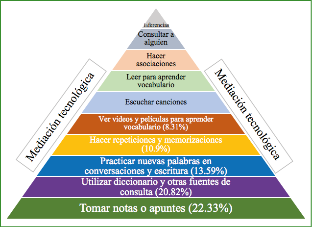 Para contestar esta pregunta medular de investigación, primero se han descrito las 13 categorías de estrategias de vocabulario que emergieron de los datos, los cuales fueron reanalizados bajo el parámetro de la mediación tecnológica. Cabe recordar que en la encuesta no se explicitó el uso de la tecnología para el aprendizaje del vocabulario, precisamente para obtener información más genuina y válida de los estudiantes encuestados.