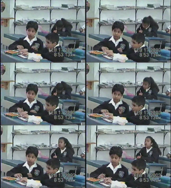 Figura 5. Jesús dicta a su compañero ciego Jesús, después de escribir con la mano derecha algo en su cuaderno, mira hacia el pizarrón y con su mano izquierda toca a su compañero, empezando entonces a leer una pequeña parte del texto a copiar (al parecer, este contacto táctil le indica al niño ciego que le está dictando); después, mientras este último escribe en Sistema Braille con su punzón y regleta, Jesús parece leer en silencio otra pequeña parte del texto del pizarrón y luego cambia su mirada hacia su propio cuaderno para seguir escribiendo. Diferentes tareas requieren un apoyo diferente por parte de los alumnos hacia Toño, y ellos parecen saberlo muy bien. Como se vio en el ejemplo de Jesús, éste domina bien la empresa de realizar su propia copia y al mismo tiempo apoyar a su compañero. En el ejemplo que se presenta en la serie de imágenes de la figura 6, se muestra cómo otro alumno apoya a su compañero en la realización de otro tipo de tarea. Los alumnos tienen que construir un termómetro utilizando para ello una botella, agua de color, un popote y plastilina. Desde que inician esta actividad, Cristian espontáneamente se sienta junto a Toño, prestándole ayuda para llevar a cabo las diferentes instrucciones que colectivamente van leyendo del libro. El alumno ciego no sólo acepta la ayuda de su compañero, sino que recurre a él en diferentes momentos para saber qué efecto está teniendo el procedimiento que realiza. En el primer cuadro de la secuencia de imágenes de la figura 6, cada uno está implicado en su propia tarea, soplando por el popote; en el segundo, el alumno ciego deja de soplar y pregunta a Cristian si el agua ya subió por el popote; en las siguientes tres imágenes Cristian examina el termómetro de su compañero y en ese momento el maestro le pregunta si su compañero ya sopló por el popote; en el último cuadro Cristian responde que no, señalando y diciendo que eso se debe al tipo de popote que su compañero está usando. Después de esto, el maestro le dice al niño ciego que debido a que el popote está oscuro no se puede ver si el agua ya subió y luego se lo cambia por otro más claro. El apoyo de Cristian se da por iniciativa propia, por lo cual puede deducirse que advierte las necesidades de su compañero ciego en este tipo de tareas. Por otro lado, Toño, también de manera implícita, indica a su compañero la necesidad específica que tiene en ese momento, al preguntarle “¿Ya subió?” y mostrarle su termómetro. La iniciativa de Cristian permite a Toño implicarse en la actividad, al compensar con su apoyo la limitación sensorial que éste tiene, en tanto se convierte en el medio a través del cual su compañero observa los efectos de su trabajo, contribuyendo de esta manera a crear condiciones muy concretas para su participación en la tarea académica en curso.