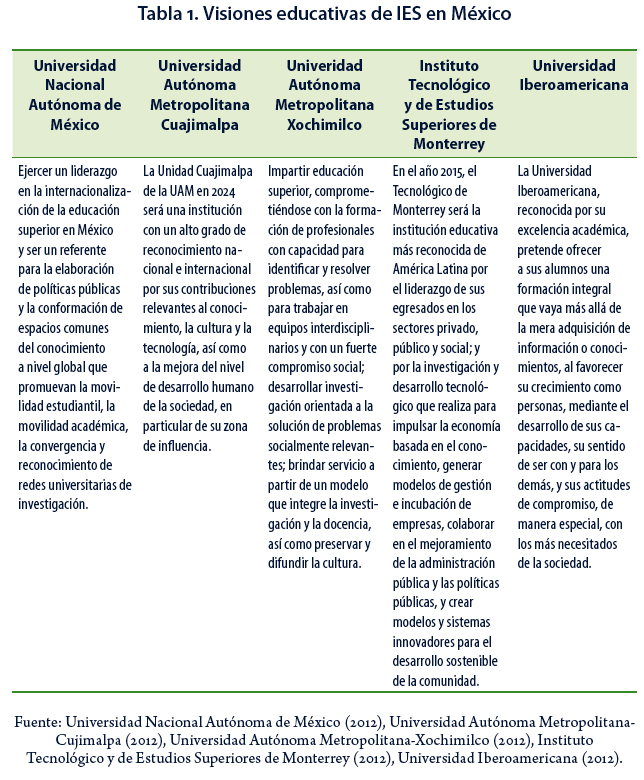 Lo hasta aquí señalado son elementos sustanciales que dan coherencia a lo que entendemos como arbitrario cultural,2 es decir, a la decisiones institucionales en materia académica, al conjunto de saberes reflejados en los programas de estudios y sobre la presencia de las TIC en el trabajo académico dentro y fuera del salón de clase. Todo esto se articula estrechamente con valores institucionales y podemos verlo plasmado en las "visiones" de las IES. Así, por ejemplo, en el caso de México, las IES públicas y privadas que hemos analizado son un claro ejemplo, como se aprecia en la Tabla 1.