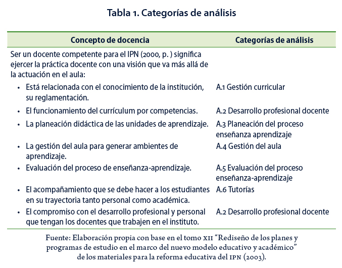 Posteriormente se procedió a dimensionar el desempeño efectivo del docente del IPN para construir las categorías de análisis. En la Tabla 1 se puede observar el proceso de construcción de las categorías de análisis a partir de la definición conceptual de la competencia en docencia.