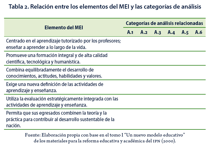 Después de contar con las categorías de análisis, se procedió a establecer una concordancia entre dichas categorías de análisis y los elementos del MEI para dimensionar los conocimientos, comportamientos, actitudes y valores requeridos para el correcto desempeño de los docentes (Strauss & Corbin, 1990). En la Tabla 2 se puede observar la relación entre los elementos del MEI y las categorías de análisis.