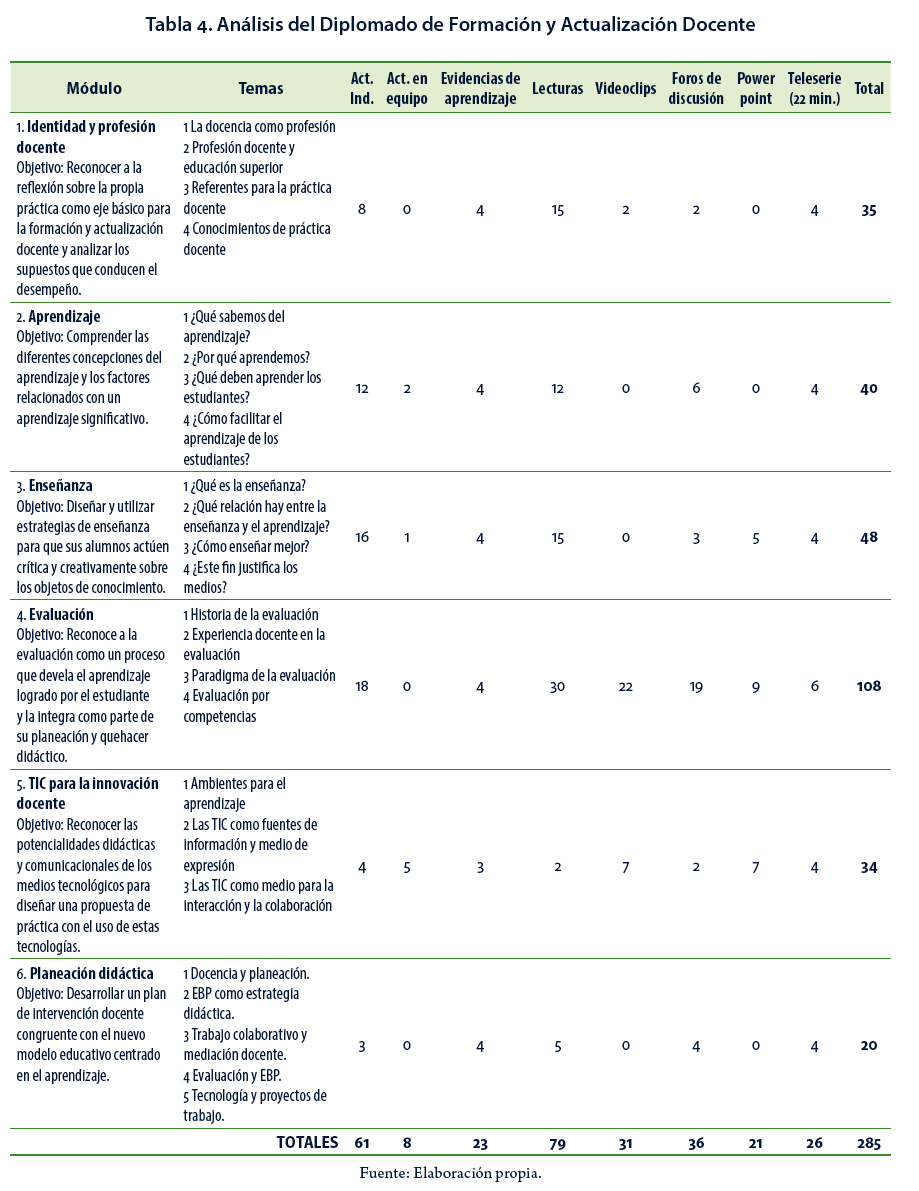 Como se observa en la Tabla 4, en cada módulo se manejan diversas estrategias de enseñanzaaprendizaje; varía mucho la cantidad de actividades, trabajos y lecturas, lo que dificulta que los docentes establezcan un plan de trabajo. En el módulo 4 los contenidos son intensivos y extensivos en el tratamiento de los temas; y los foros de discusión tienen que trabajarse también como actividades duplicando el trabajo. Adicionalmente, la presentación de los contenidos es diferente, algunos módulos son muy interactivos (módulo 3) y otros sólo presentan texto plano a lo largo de las pantallas (módulo 6).