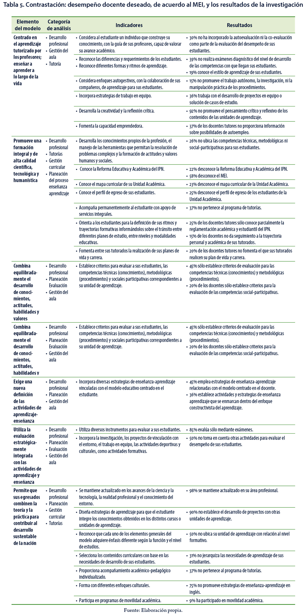 Cada módulo se presenta para incidir en algún aspecto neural de la práctica de los docentes (Cano, 2008; Imbernón, 2009; Zabala & Arnau, 2007): la identidad docente, el aprendizaje, la enseñanza, la evaluación, el manejo de las TIC y la planeación didáctica de nuestros cursos. No obstante, la contrastación del desempeño docente deseado, de acuerdo con el MEI, y los resultados de la investigación (ver Tabla 5) muestran que a pesar de que la planta docente posee, estadísticamente hablando, un alto grado de formación y actualización (98%), ésta no ha logrado permear las concepciones implícitas de los docentes sobre el modo de pensar y hacer la enseñanza; por lo que continúan ejerciendo su práctica con base en la experiencia adquirida.