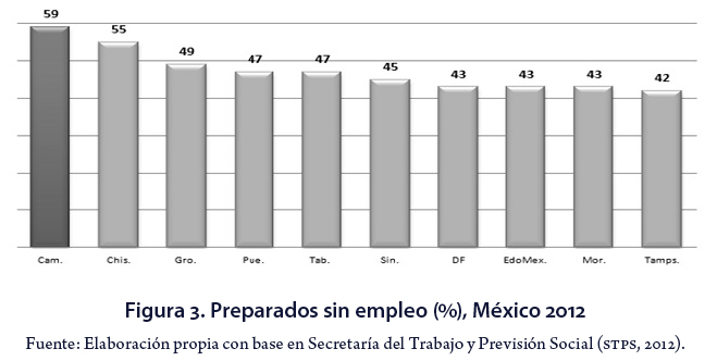 A nivel nacional esta entidad se colocó en 2012 en el sexto lugar en el índice de preparados sin empleo, empatada con el Distrito Federal (DF) y el estado de Morelos, lo que significó que de cada 100 personas con estudios profesionales, 43 se encontraban sin empleo (INEGI, 2013) (Figura 3).