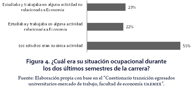 Se planteó la pregunta: ¿cuál era su situación ocupacional durante los dos últimos semestres de la carrera?, con la intención de conocer qué porcentaje de los egresados de economía trabajó y estudió al mismo tiempo; 55% respondió que los estudios eran su única actividad, es decir, que la mayoría prefirió dedicar su tiempo a formarse. En tanto que 23% contestó que estudiaba y trabajaba en alguna actividad no relacionada a economía; 22% estudiaba y trabajaba en alguna actividad relacionada con la economía, destacando que el 45% contaba con experiencia laboral, situación que pudo influir en su contratación y alta tasa de empleabilidad (véase Figura 4).