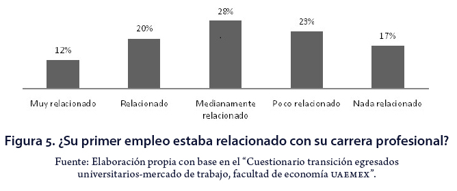 Al analizar el mercado de trabajo no únicamente se trata del número de empleos que se crean cada mes, sino de la calidad que ofrecen dichos empleos a los jóvenes recién egresados de economía, es decir, la compatibilidad entre la formación universitaria y las vacantes disponibles. Para comprobar la afinidad que tiene el tipo de empleo en los que se han contratado y la preparación, se preguntó si su primer empleo estaba relacionado con su carrera profesional. Las respuestas fueron: 12%, "muy relacionado"; 20%, "relacionado"; 28%, "medianamente relacionado"; 23%, "poco relacionado"; 17%, "nada relacionado" (véase Figura 5).