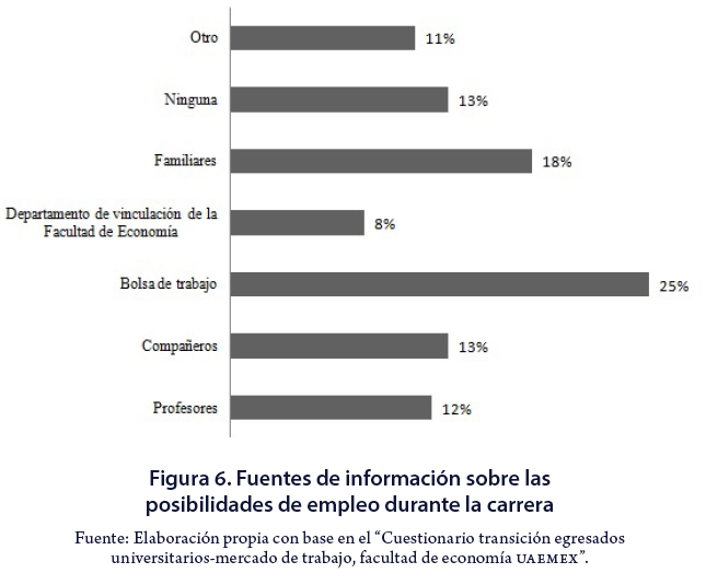 La teoría de la búsqueda también menciona que las personas desempleadas incurren en costos de información. Para conocer si este supuesto se cumple en el caso que nos ocupa, se formuló la pregunta: ¿cuáles fueron sus fuentes de información sobre las posibilidades de empleo durante la carrera?, y 43% contestó que por medio de una "bolsa de trabajo" y "familiares" (véase Figura 6). Lo cual es un reflejo de la era tecnológica en la que viven los jóvenes; la mayoría de las bolsas de trabajo se encuentran disponibles de forma gratuita en línea, y son consultadas a través de Internet. Por otro lado tenemos la dependencia en las relaciones sociales, principalmente en las relaciones familiares como primera alternativa de vinculación al mercado de trabajo.
