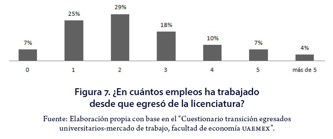 Ahora bien, fue importante conocer en cuántos empleos han trabajado desde que egresaron de la licenciatura; 54% oscila entre uno y dos empleos. La frecuencia más alta se centró en dos empleos, tal como se puede apreciar en la Figura 7. Lo anterior indica que la rotación que han tenido los jóvenes licenciados en economía no es muy alta, lo que les permite capacitarse y adquirir experiencia en su ámbito laboral.