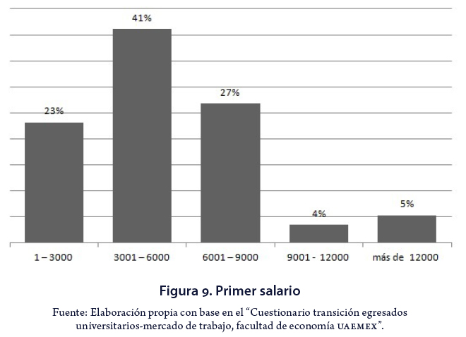Otra de las características que permite evaluar si el proceso de transición es "bueno" para los egresados es el nivel salarial al que pueden aspirar. En el rango de $1 a $3,000 de salario mensual se registró 23% de las respuestas; de $3,001 a $6000, 41%; de $6,001 a $9,000, 27%; de $9,001 a $12,000, 4%; y más de $12,000, 5%. El mayor porcentaje 41%, reportó que su primer salario se encontró en el rango de $3,001 a $6,000; y en el acumulado 91% se situó entre $1 y $9,000 pesos (véase Figura 9). El rango promedio en comparación con los indicadores salariales de 2013 para el Estado de México (STPS, 2013) que son de $11,071 (ingeniería mecánica y metalurgia) el más alto y $6,190 (estomatología y odontología) el más bajo, se encuentra en la media del rango salarial de la entidad. Es decir, si se grafica el promedio salarial por profesión, los licenciados en economía se situarán en el centro.