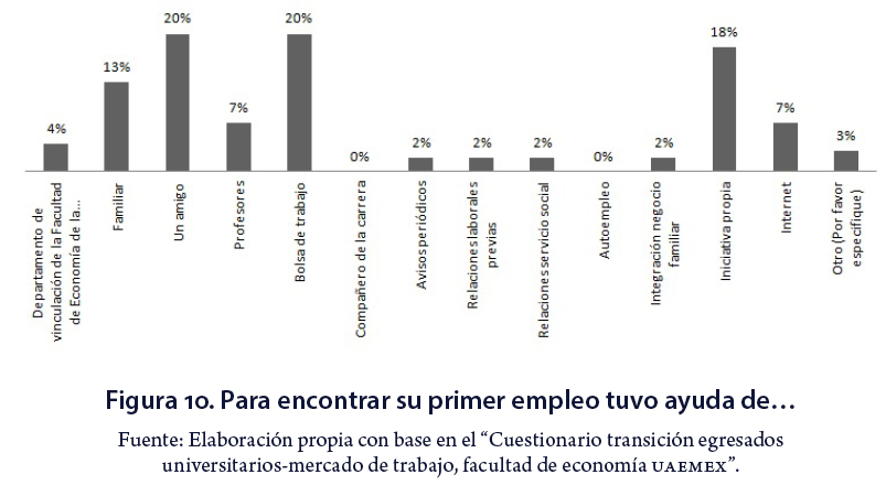 La siguiente característica a evaluar fue conocer quién ayudó al egresado a encontrar su primer empleo. El entorno social en el que el joven licenciado en economía se desarrollaba al momento de egresar, de acuerdo con la teoría de la búsqueda, se considera que es donde busca apoyo para insertarse a la vida profesional. Se formuló la pregunta: Para encontrar su primer empleo, tuvo ayuda de... La respuesta que mayor porcentaje obtuvo fue "un amigo"; seguida de "bolsa de trabajo" e "iniciativa propia" con una diferencia de un punto porcentual (Figura 10). Es interesante observar cómo las relaciones de amistad son el factor que se consideró más importante para emplearse; el factor "familia" también influyó en un alto porcentaje, como se puede apreciar. La proporción que obtuvo "Internet" fue muy diferente a lo que se pudiera esperar; dado que el mundo de las Tecnologías de la Información (TIC) juega un papel muy importante, lo que se esperaría es encontrar que en las últimas generaciones consideradas en este estudio el uso de Internet para buscar trabajo fuera mayor, sin embargo, únicamente cuatro personas seleccionaron esta opción.