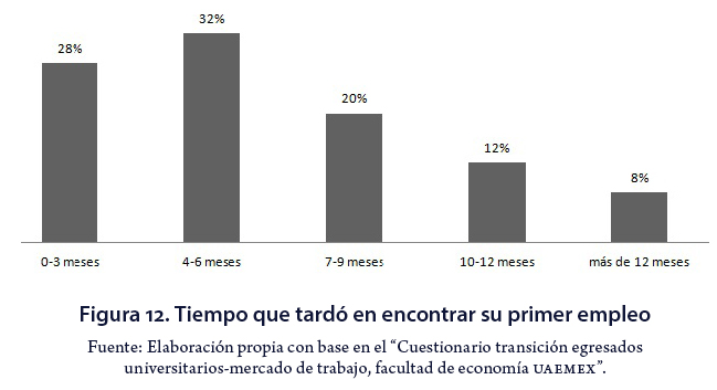 Para conocer la frecuencia que tiene el "modelo de la búsqueda secuencial" se preguntó cuánto tiempo tardó en encontrar su primer empleo, después de egresar: 28% respondió que tardó entre 0 y 3 meses; 32%, entre 4 y 6 meses; 20%, entre 7 y 9 meses; 12%, entre 10 y 12 meses, y 8% más de 12 meses (Figura 12). Con lo que se infiere que el tiempo que pasan los jóvenes egresados en el proceso de "búsqueda" es corto, ya que 60% tardó entre 0 y 6 meses en encontrar su primer empleo, haciendo que el proceso de transición sea fluido para ellos.