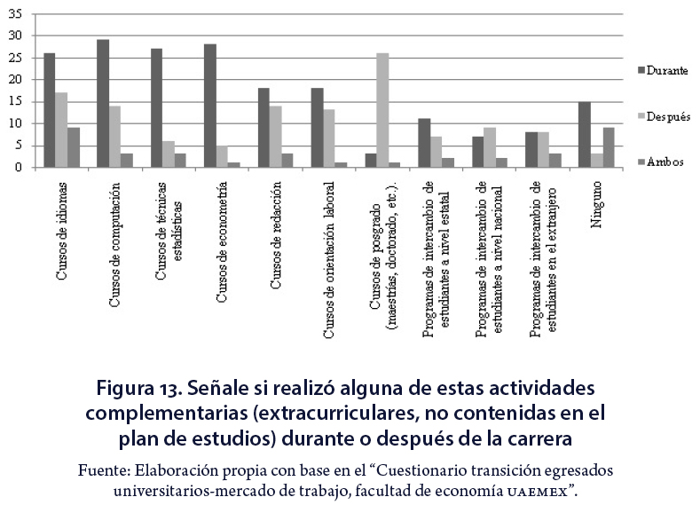 Al ver la importancia de la capacitación y formación, se cuestionó si se formaron en algunas habilidades y competencias complementarias o si participaron en actividades extracurriculares durante sus estudios, después o ambos tiempos, que ayudaron a reforzar su formación profesional (Figura 13).
