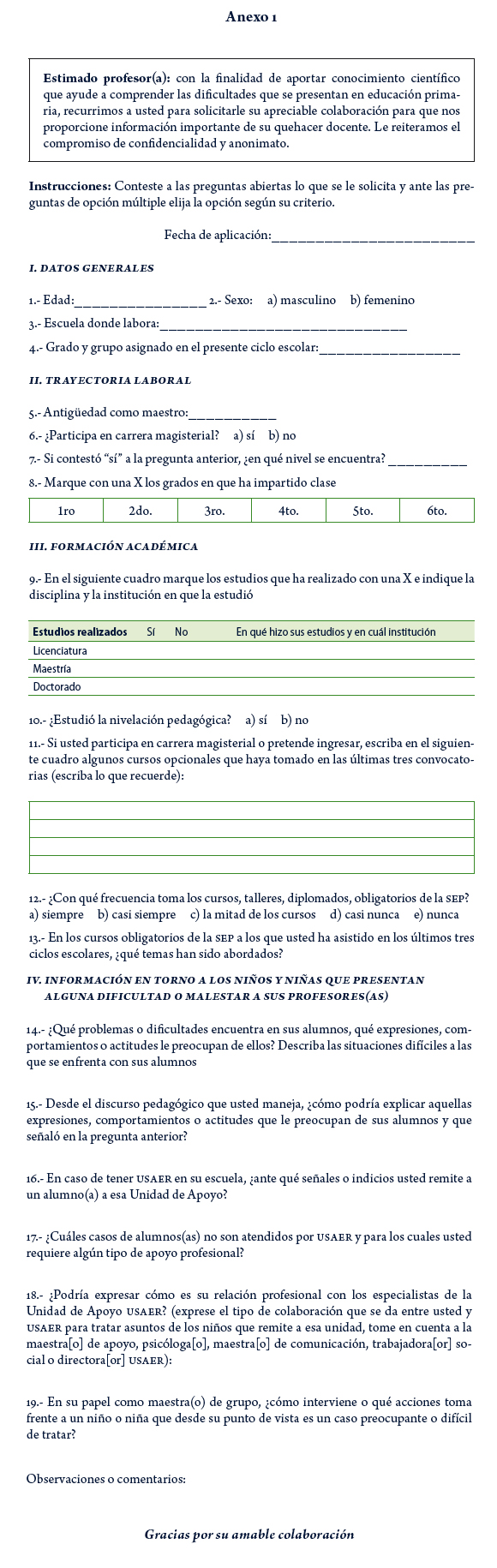 El primer acercamiento fue con la profesora de grupo, mediante un cuestionario que permitió identificar las dificultades o problemáticas de sus alumnos, y a partir del análisis de su discurso se establecieron fragmentos que relacionan las situaciones familiares de éstos con las dificultades en el contexto escolar.