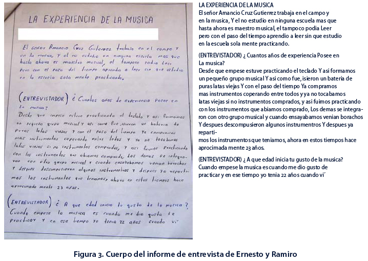 Escriben la pregunta ¿Cuantos años de experiencia posee en La música? y después discuten cómo darle respuesta. Aquí entra en juego otro elemento muy interesante, ya que a Ernesto le parece hasta chistoso escribir que Amancio empezó tocando con unas latas viejas (una anécdota que les contó). Se pregunta si es importante hablar de ello en el informe e incluso recurre a la revisión del guión de preguntas y al libro de texto para buscar un referente de qué escribir. Como vemos, reflexionan seriamente sobre la información por conservar y recuperar en el texto.