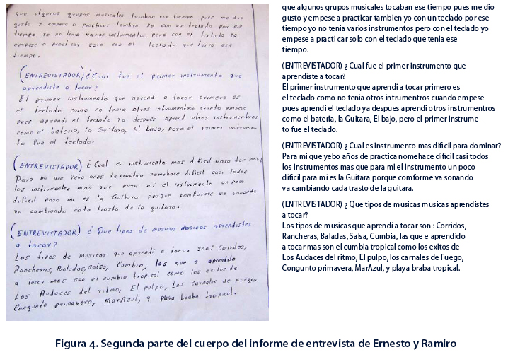 El estudiante busca mostrar la manera en que el músico les narró sus experiencias. Trata de ser lo más fiel posible a lo que su entrevistado contestó, es decir, es cuidadoso a nivel semántico. Sin embargo, ya no se detiene a discutir tanto con Ramiro los aspectos ortográficos. Su meta es terminar antes de que se haga más noche.
